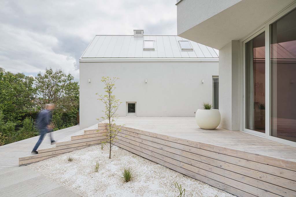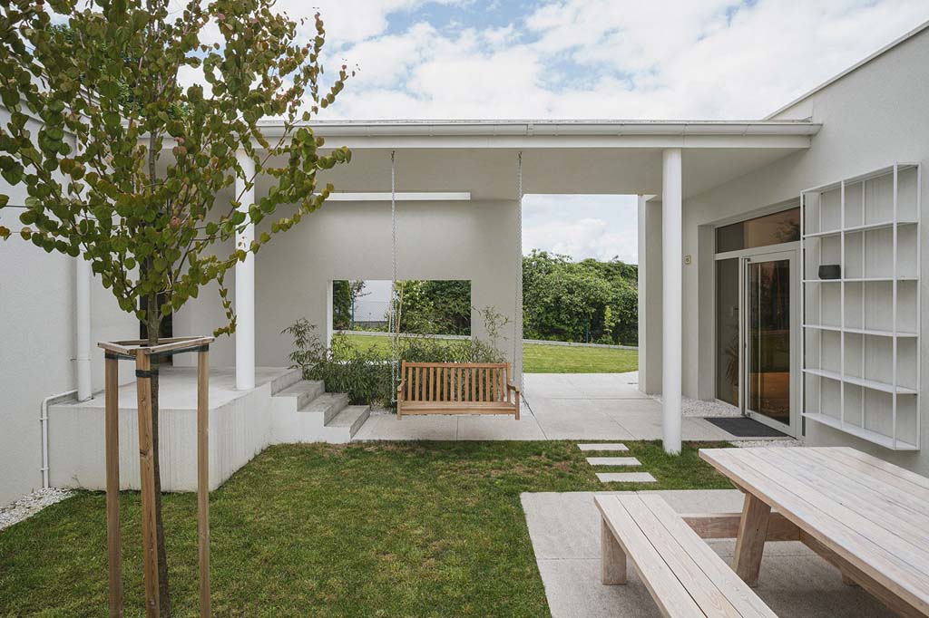 Wyście z salonu prowadzi na południową część działki, natomiast z jadalni mieszkańcy wychodzą na patio północno-zachodnie. Oba są umiejscowione tak, aby przechodnie nie widzieli, co dzieje się w środku. Dom jest otwarty na otoczenie, ale jednocześnie zachowana została prywatność jego mieszkańców.