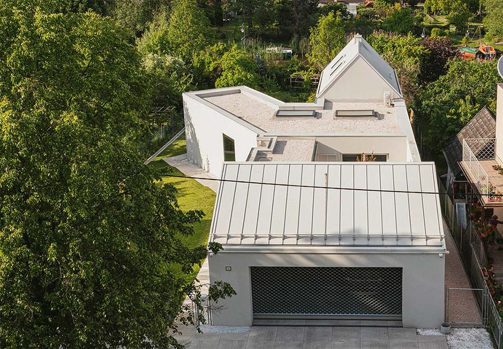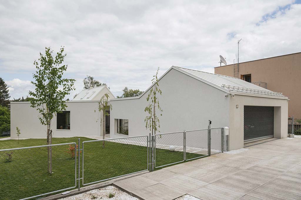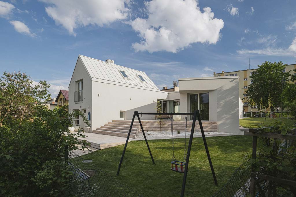 Otoczenie działki jest dość specyficzne. Wokół znajdują się bloki i domy jednorodzinne o różnych kształtach i proporcjach, które powstały na przestrzeni lat 60. Typowe otoczenie, z jakim można się spotkać w małych miastach. Dom miał być inny od pozostałych, a jednocześnie zintegrowany z otoczeniem. Ten projekt wyróżnia z sąsiedztwa przede wszystkim kształt i biały kolor. Jego forma jest uzasadniona przez funkcję oraz konkretne cechy lokalizacji tego miejsca.