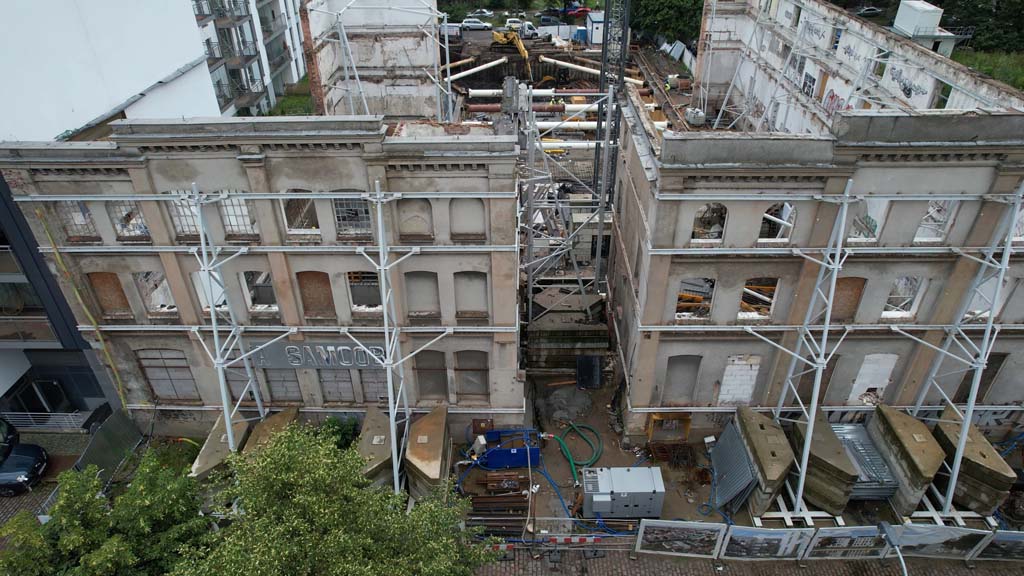 Generalny wykonawca inwestycji, tuż po zakończeniu prac rozbiórkowych przystąpił do działań geotechnicznych, które obejmowały budowę palisady stanowiącej obudowę wykopu oraz palowania pod płytą fundamentową. Te działania były kluczowe dla zapewnienia stabilności konstrukcji i bezpieczeństwa całego przedsięwzięcia. Pod stałym nadzorem archeologa, prowadzone są również prace związane z remediacją gruntu, co ma na celu nie tylko zapewnienie zgodności z najwyższymi standardami ochrony środowiska, ale także ochronę dziedzictwa historycznego miejsca. Równocześnie zespół budowlany ALSTAL wnosi konstrukcję części podziemnej, co stanowi kolejny ważny krok na drodze do realizacji projektu.