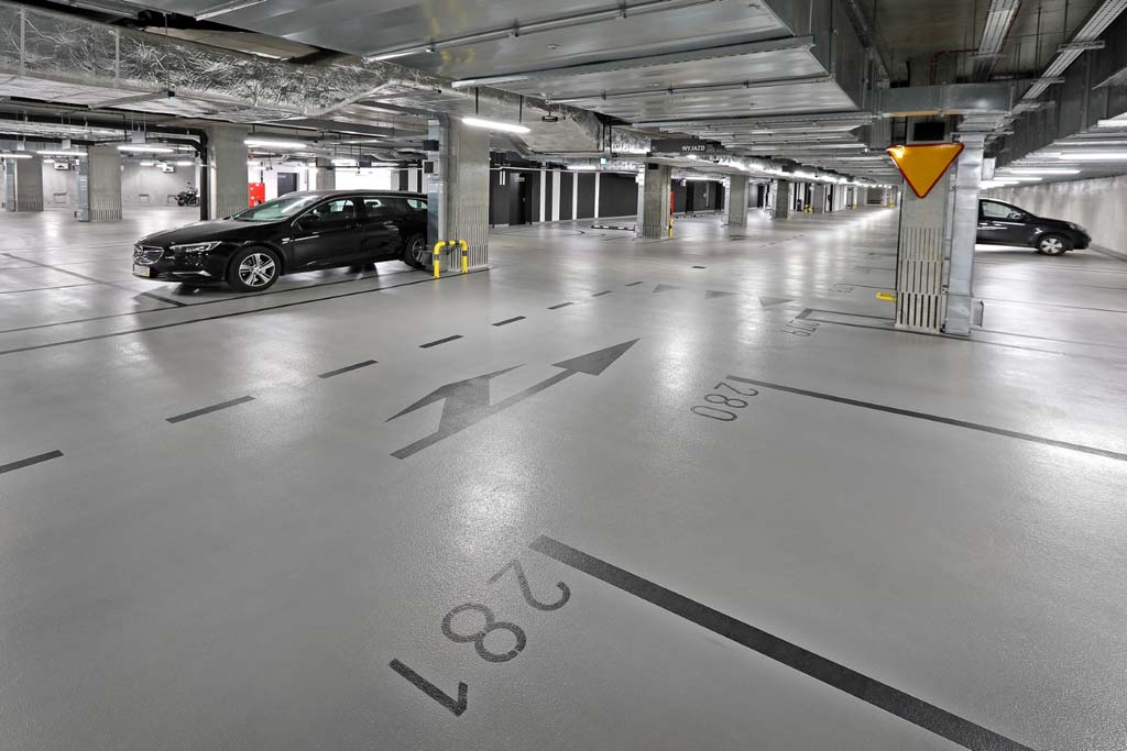 Kolorystyka powłok żywicznych zastosowanych w garażu podziemnym .KTW jest utrzymana w odcieniach szarości. Posadzki Deckshield na rampach i na poszczególnych kondygnacjach są szare (w kolorze Mid Grey), a oznakowania poziome zostały namalowane kontrastową, ciemnoszarą żywicą. Takie zestawienie barw gwarantuje dobrą widoczność z punktu widzenia osób kierujących pojazdami i zwiększa bezpieczeństwo wszystkich uczestników ruchu.