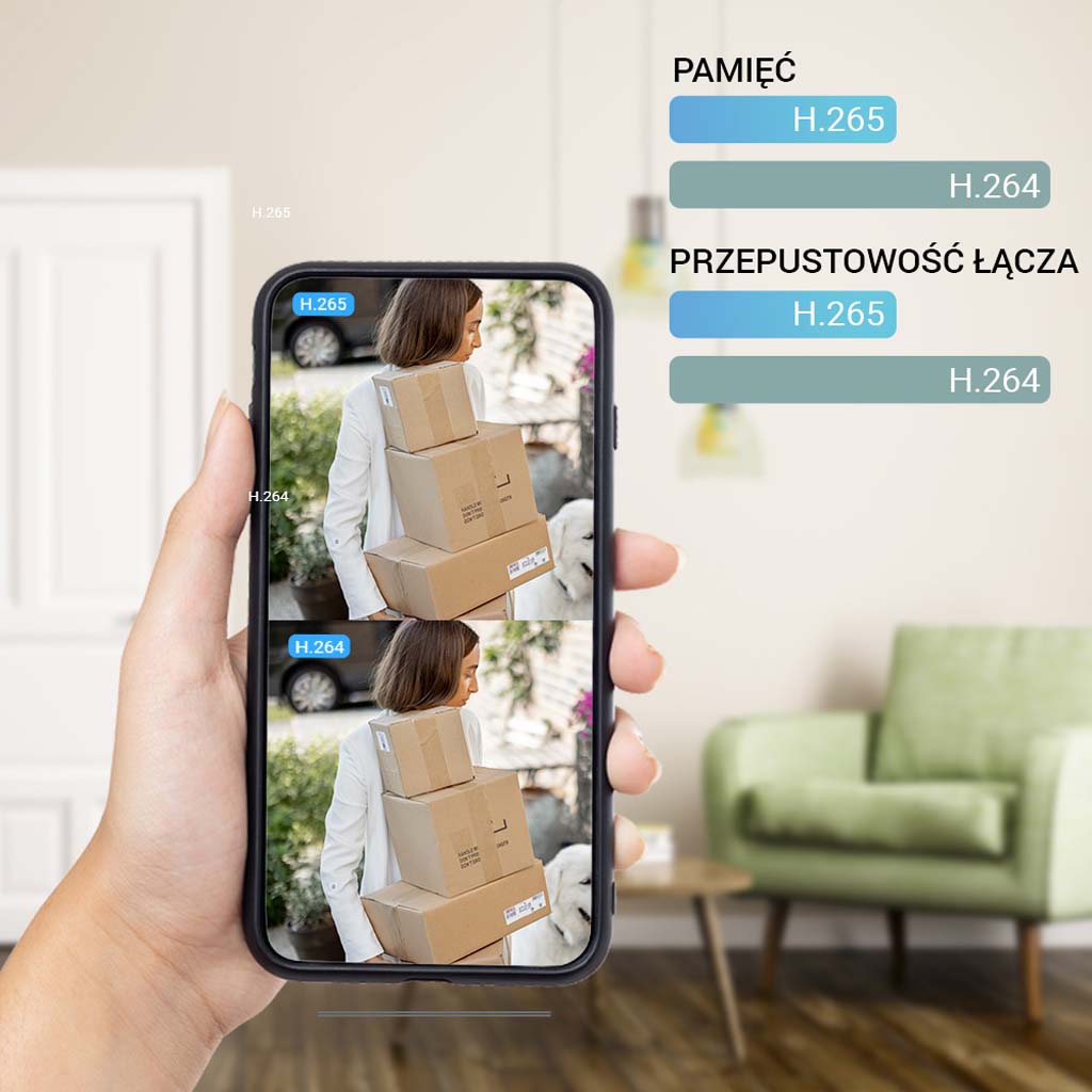 Wideodomofon HP4 używa najnowszej technologii kompresji wideo H.265, inaczej kodek HEVC. W porównaniu do dominującej na rynku H.264 standard H.265 pozwala na płynniejsze oglądanie nagrań. Jednak nie trzeba się martwić, że duże pliki zajmą zbyt dużo miejsca na dysku – kodek HEVC zmniejsza rozmiar wideo nawet o połowę.